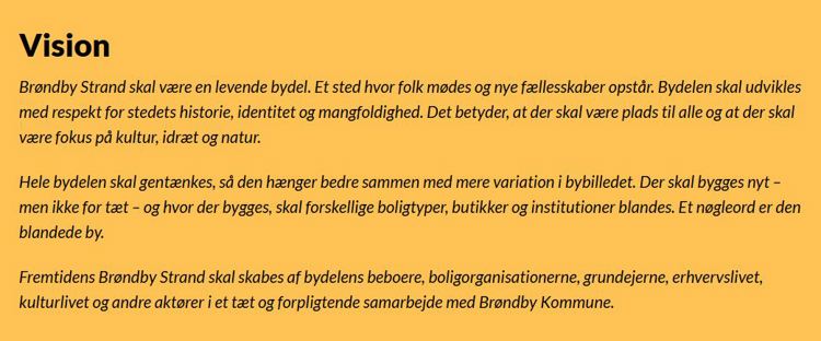 I opstartsfasen udviklede Kommunalbestyrelsen i dialog med borgere og interessenter i Brøndby Strand en vision for bydelen. Visionen er overordnet og sætter retningen for det efterfølgende arbejde.